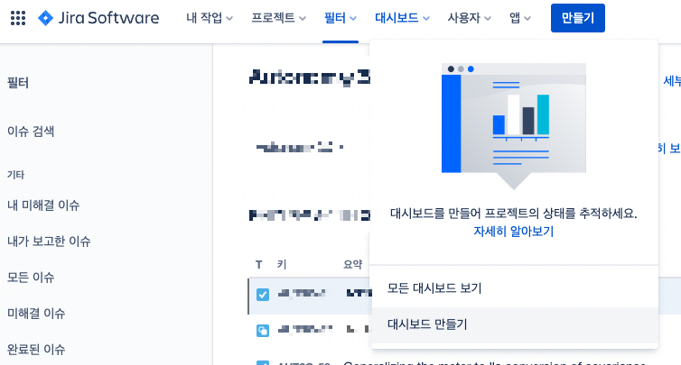 필터 생성을 완료했다면 대시보드 생성해보도록 합니다. 필터까지 만들었는데 대시보드를 만들어야 하는 이유는 차트 형태로 진행상황을 한 눈에 파악하기 쉽기 때문입니다. 1. 상단 메뉴에서 대시보드 - 대시보드 만들기 선택합니다. 2. 대시보드 이름 및 권한 설정해줍니다. 3. 모든 대시보드 보기에서 생성된 대시보드 확인해봅니다. 4. 대시보드 구성하기 4-1. 대시보드 페이지에서 편집 버튼 클릭합니다. 4-2. 필요한 가젯 추가합니다. 파이 차트 통계 유형 : 우선순위로 설정하는 것을 권장합니다. 2차원 필터 통계 (우선 순위 대비 작업자 할당량 확인 용도) x축 : 우선순위 y축 : 담당자 생성 대비 해결 차트 (일간 이슈 발생량 확인) 미해결 이슈의 유형 표시하도록 설정하는 것을 권장합니다. 모든 버전 ..